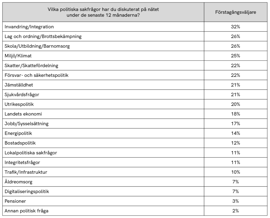 • Förstagångsväljarnas åsikter tycks vara särskilt formbara av politiska diskussioner på nätet. Fler än 2 av 10 (22%) har ändrat sin åsikt efter politiska diskussioner på nätet jämfört med endast 7 procent i hela befolkningen. Denna andel är dessutom väsentligt större än bland 2022 års förstagångsväljare, där knappt var sjunde svarade detsamma (13%). Förstagångsväljare är också mer aktiva när det gäller att diskutera politiska frågor på nätet jämfört med äldre väljare, vilket nästan varannan (47%) har gjort under året.